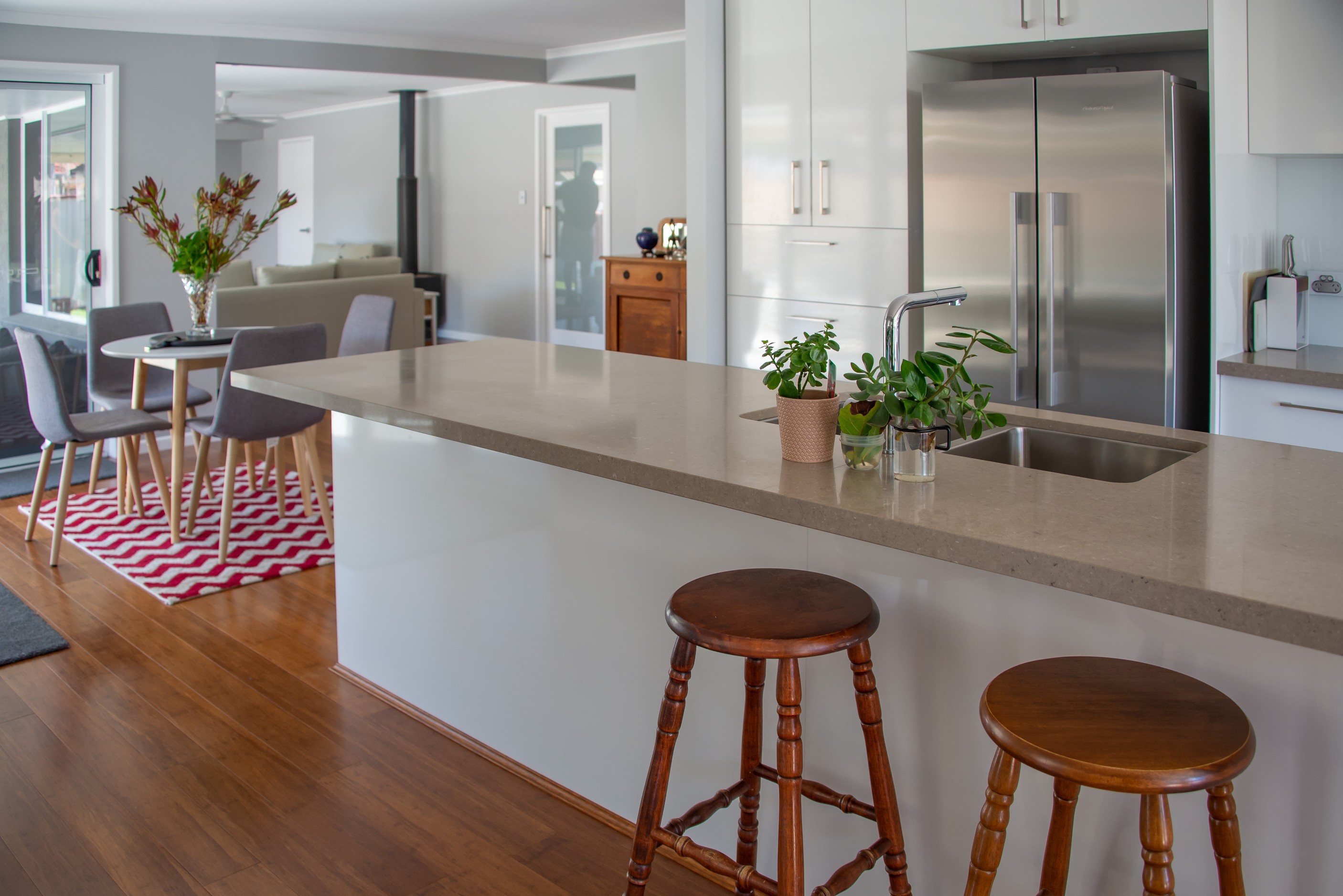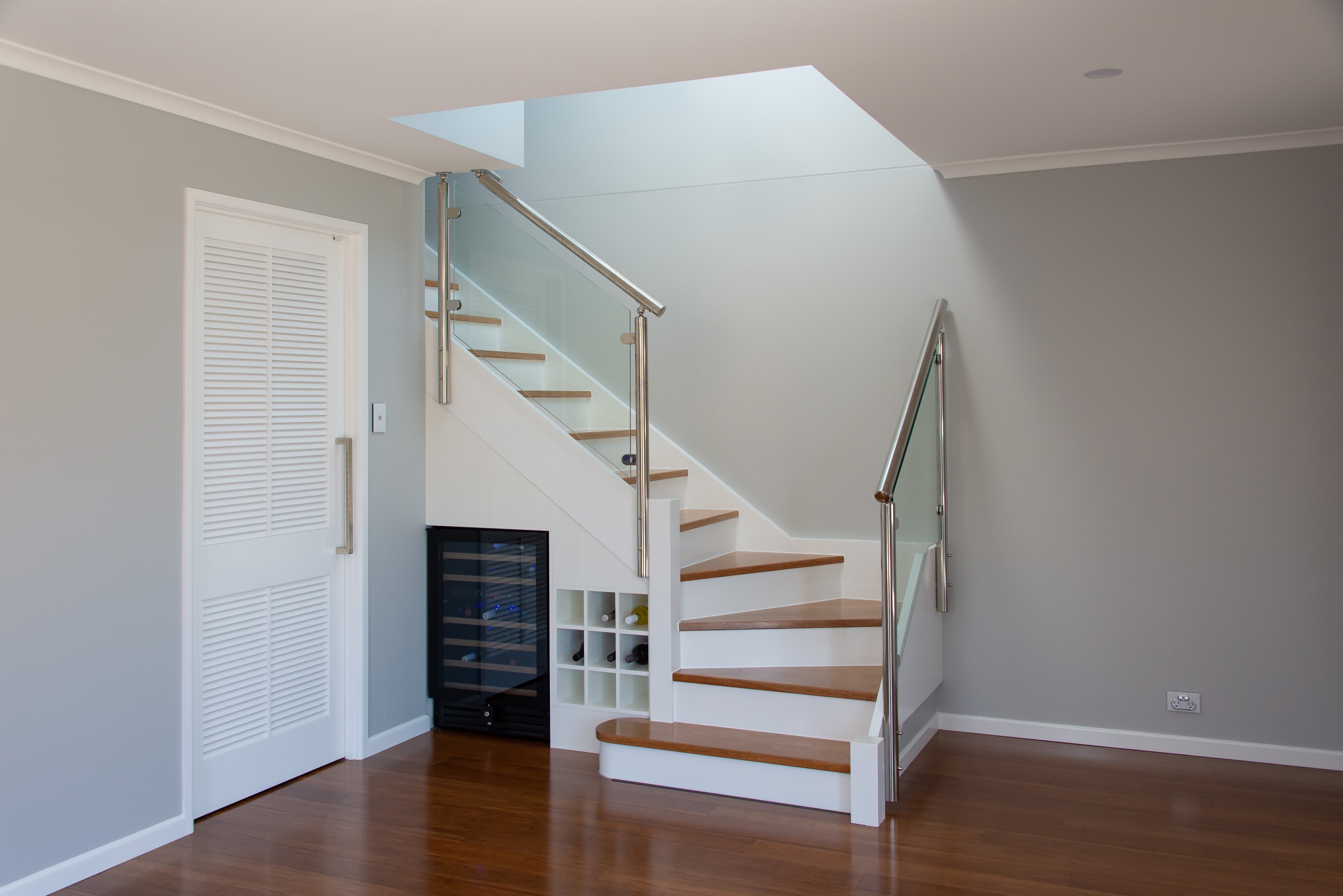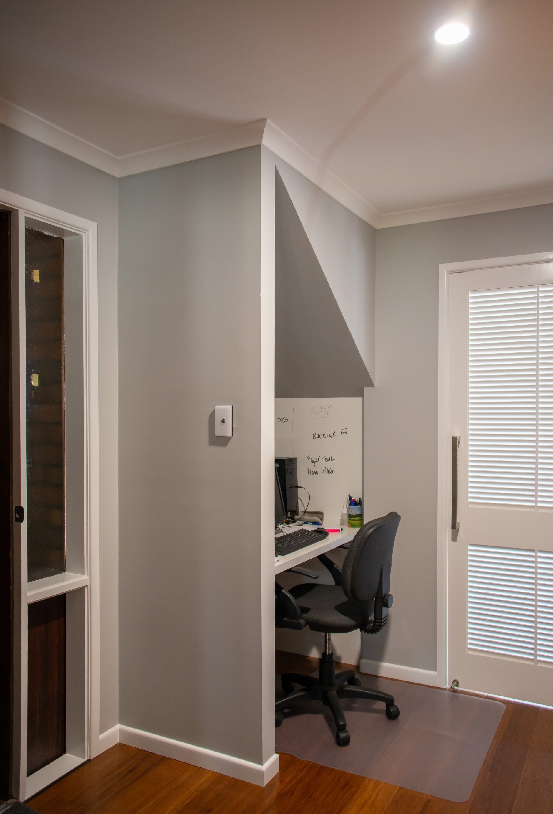 - Downstairs we relocated the kitchen area, and opened up the layout. Also included replacing windows with doors at the front of the house to allow for access to new porch area outside, a new custom kitchen, a renovation to the laundry, a study/office nook and new staircase with wine fridge built in under. New timber flooring was also installed downstairs